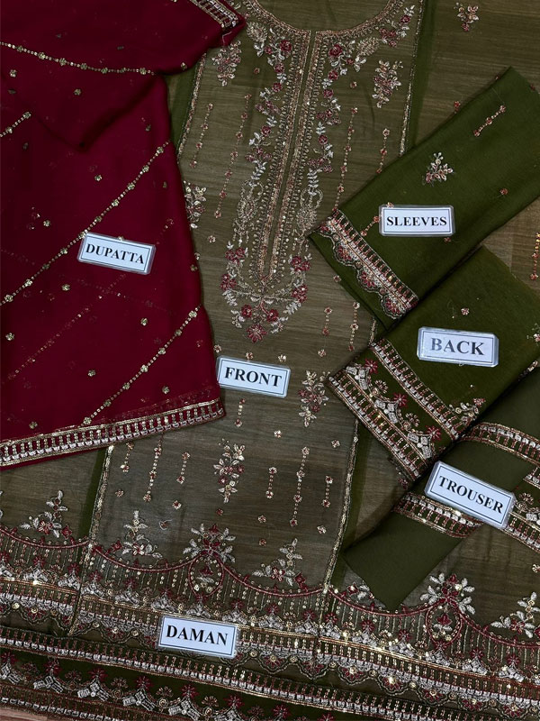 Embroidered Chiffon Dress Set (3 Pcs Unstitched) – Maroon & Green | Heavy Zari Thread & Sequins Work | Wedding Party Wear