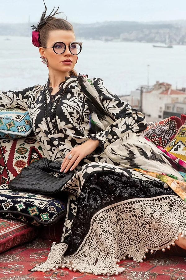 : Shop Maria.B’s digital printed unstitched pure lawn 3Pc suit (MPT-2307-B) in beige & black. Features embroidered details, chiffon dupatta, and premium lawn fabric. Perfect for festive & formal wear.