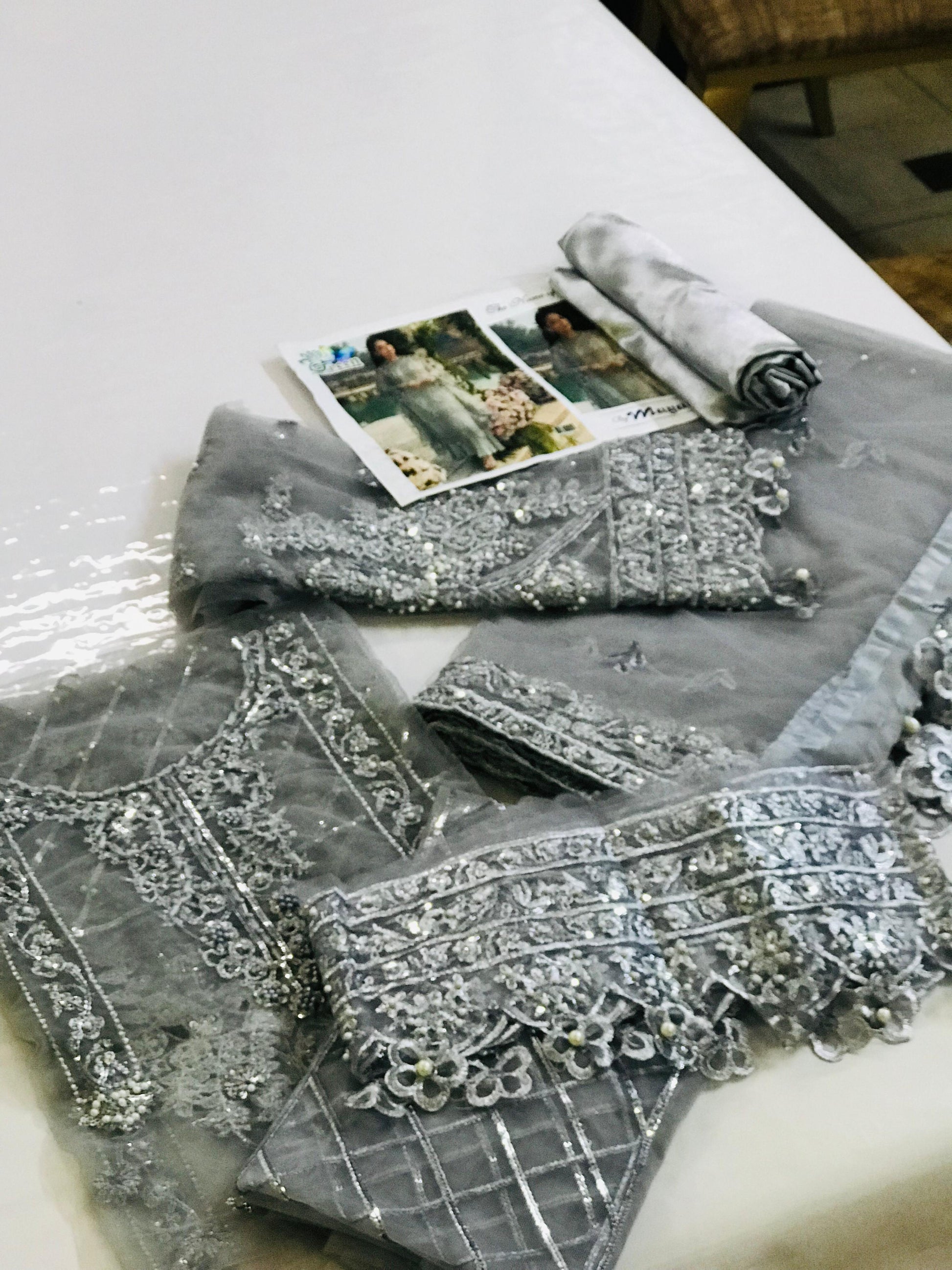 Draped in sophistication, the Meeral Luxe Grey ensemble redefines bridal luxury with its intricate threadwork, sequins, and lock pearls on delicate net fabric. Perfect for walimas, receptions, or festive soirées, this outfit blends timeless craftsmanship with contemporary grace.