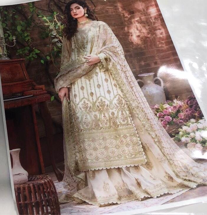 Elevate your special occasions with the Mehrunisa Luxury Off-White Embroidered Sharara Dress, a masterpiece of intricate craftsmanship. Designed for weddings, Valima parties, bridal showers, mehndi, dholki, and jalebi events, this stunning ensemble blends timeless elegance with contemporary design.