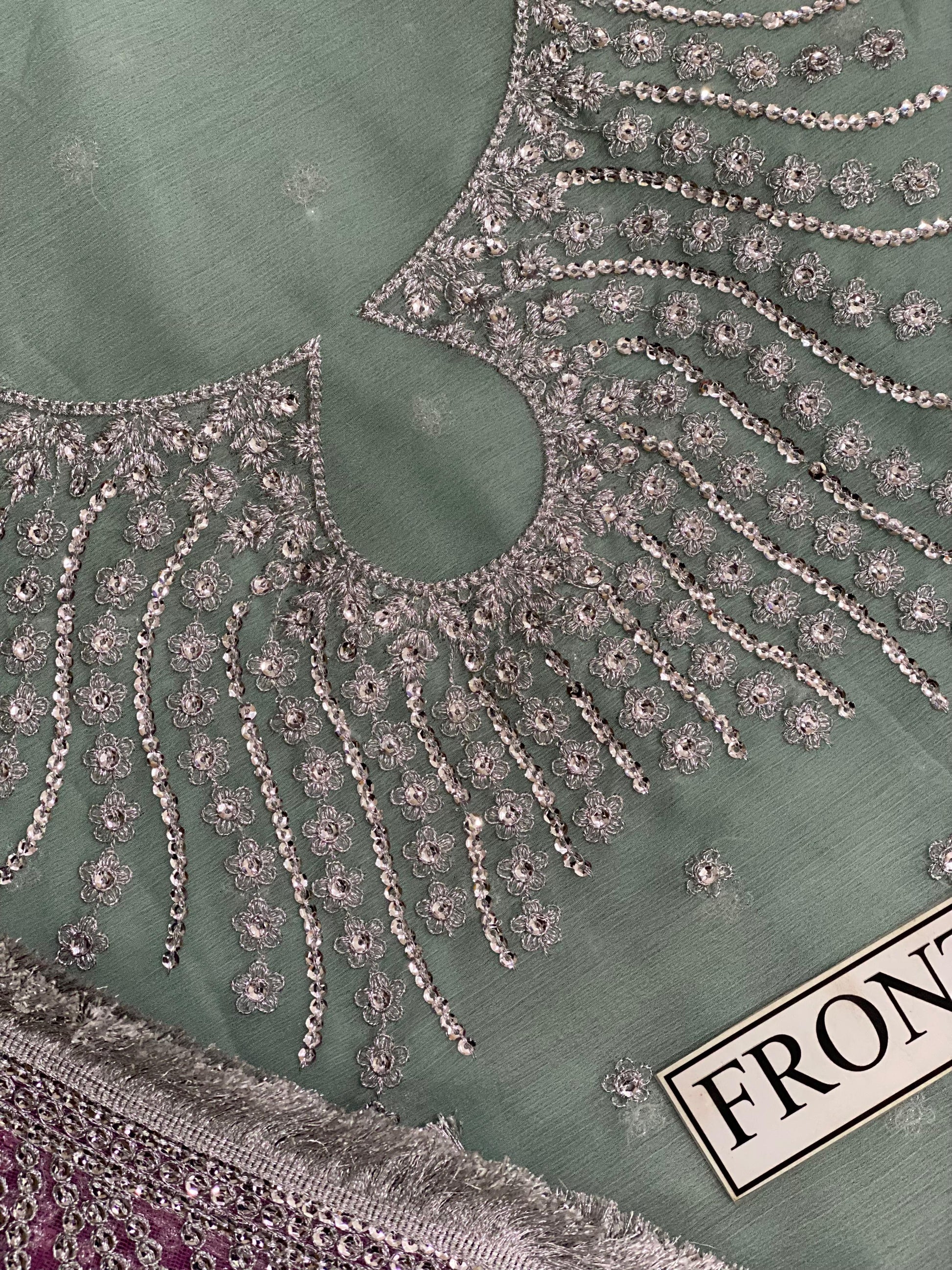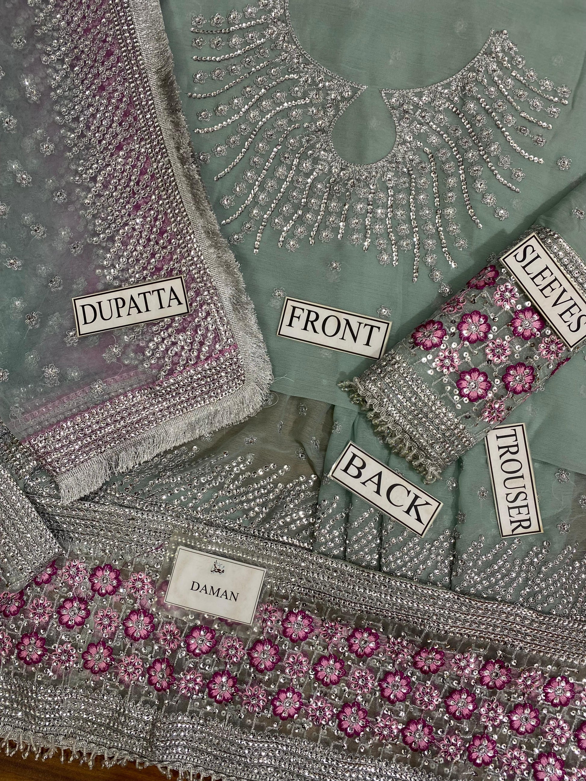 "Pink Aqua Chiffon Maxi with Net Dupatta & Silk Trouser – Embroidered Zari Work, Sequins, and Stones"