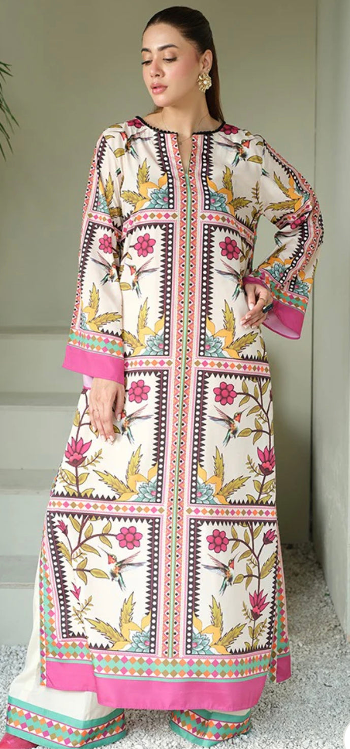 Digital Printed Charmeuse Silk Shirt & Trouser Set with Silk Dupatta – Luxury Loungewear & Party Wear
