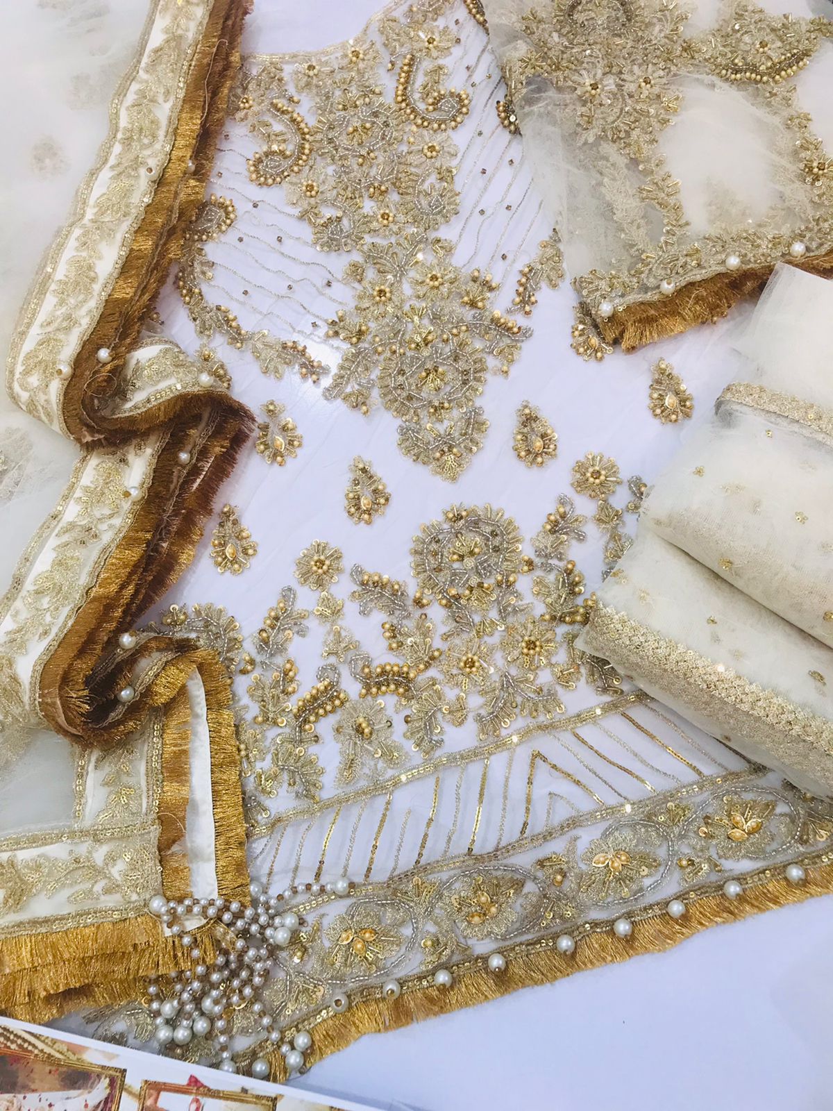 ✔ Dupatta: Features an appliqué embroidered border with 4-side kiran lace and pearl tassels for a luxurious finish.